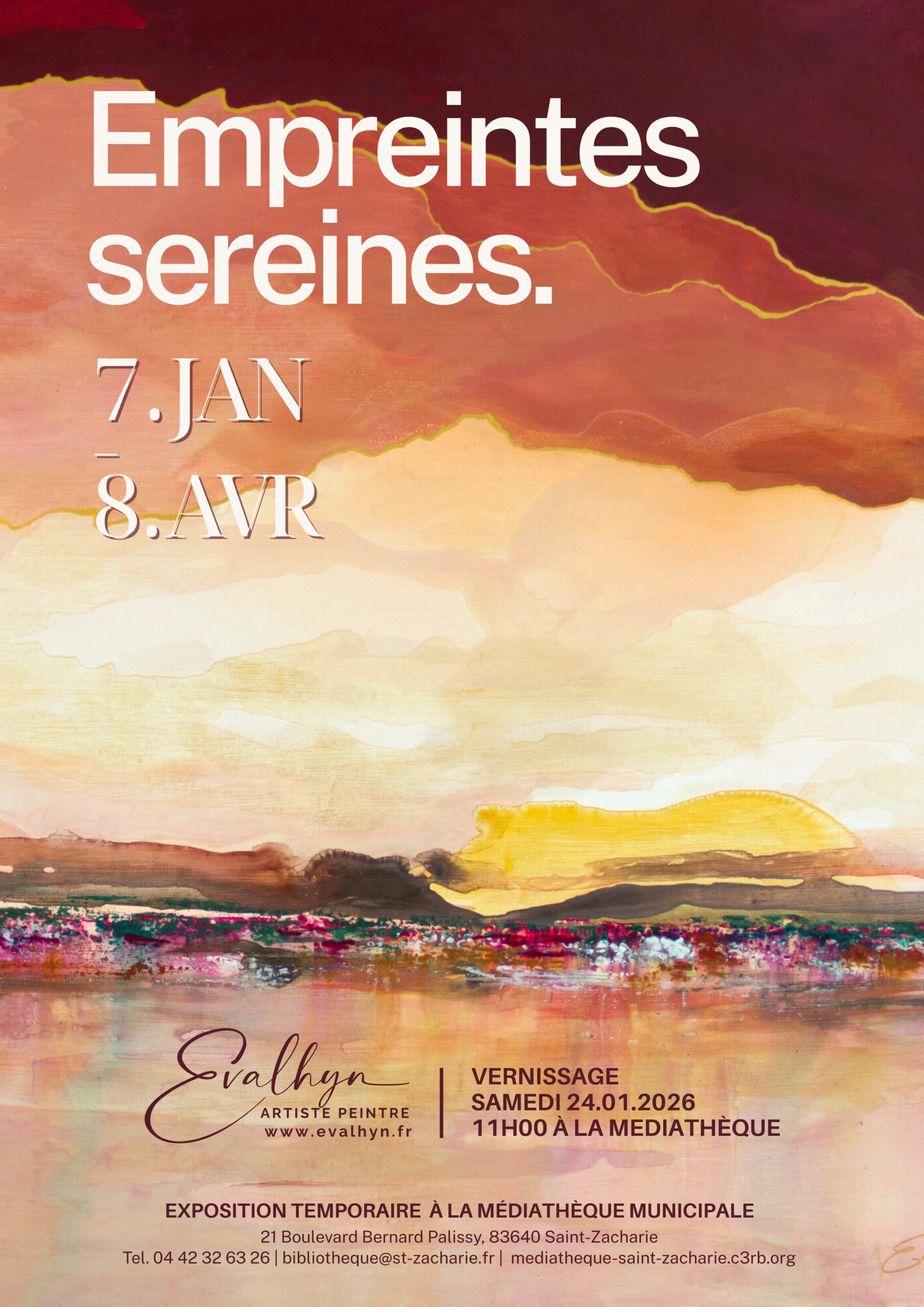 La médiathèque a le plaisir d’accueillir l’exposition « Empreintes sereines » de l’artiste peintre Evalhyn, du 7 janvier au 8 avril 2026. Installée à Saint-Zacharie, Evalhyn développe un univers pictural délicat et poétique, articulé autour de deux grandes séries. Ses portraits féminins, riches en motifs et en couleurs, donnent naissance à des muses ornementales où […]